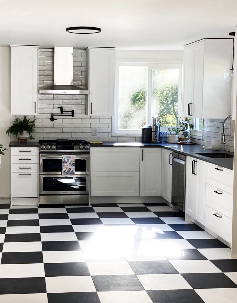 Do you want to brighten your kitchen with white cabinets and countertops, offset by darker wood grain flooring? Or do you prefer the richness of wood in your cabinets, with dramatic black countertops and dappled flooring? Or perhaps a classic, elegant black and white, highlighted by the texture of backsplash tiling?